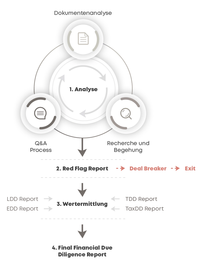 Die Untersuchungsergebnisse werden in dem finalen Financial Due Diligence Report zusammengefasst. Mit diesem Report erhalten Sie nicht nur eine Bewertung des Status Quo, sondern auch eine Zusammenstellung von Chancen und Risiken, Entwicklungspotenzialen, Lösungsvorschlägen und Handlungsempfehlungen, die Ihnen als Grundlage für eine solide Investitionsentscheidung dient.